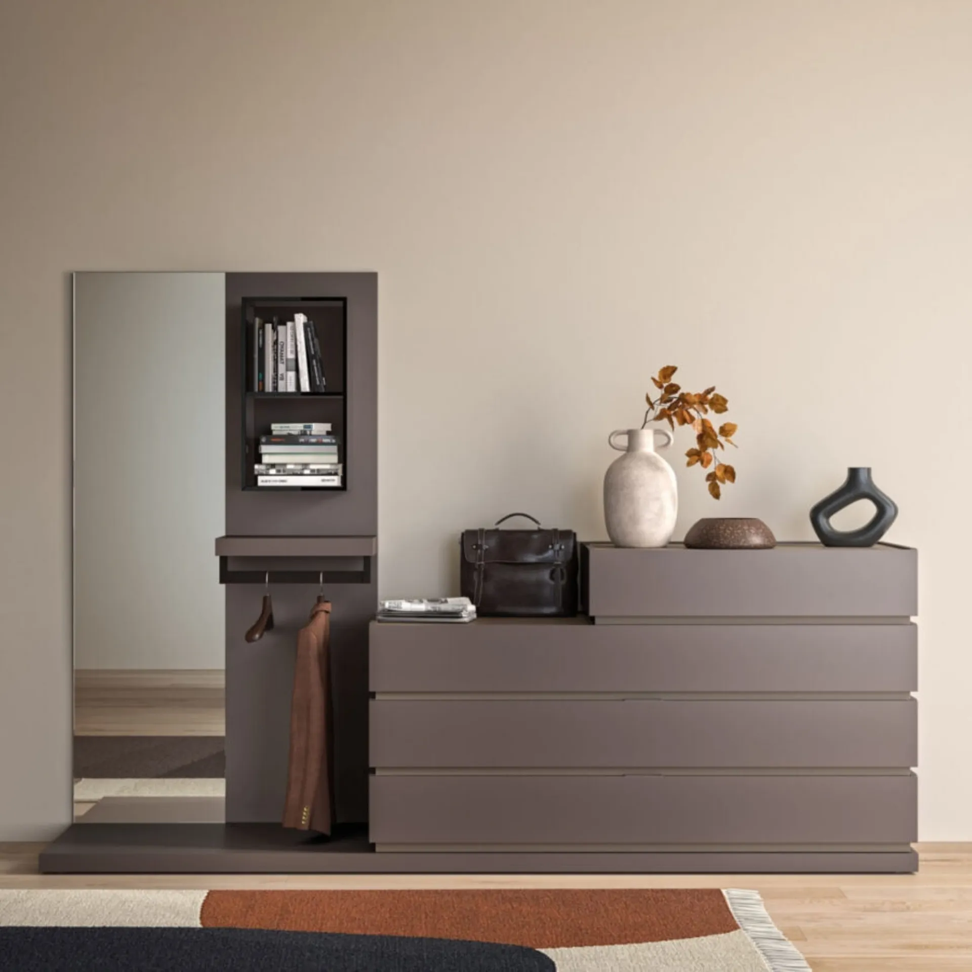 Con i nostri gruppi notte moderni dell'azienda Orme, leader dell’Arredamento Casa per la zona del riposo, potrai creare la camera che hai sempre desiderato. La zona del riposo comprende anche i Comodini: mobili per contenere strategici che permettono di ordinare oggetti e avere a disposizione piani per appoggiare multiuso. Valorizza i tuoi spazi scegliendo composizioni di arredi abbinati o crea eleganti accostamenti di stile e tonalità per merito del catalogo di mobili e oggetti accessori per la zona del riposo che proponiamo, come il modello in laccato opaco presente in foto, anche realizzabili su misura per te. Comò Compongo con appendiabiti di Orme: contattaci e scopri di più sulle nostre composizioni e arreda la camera come l'avevi immaginata.